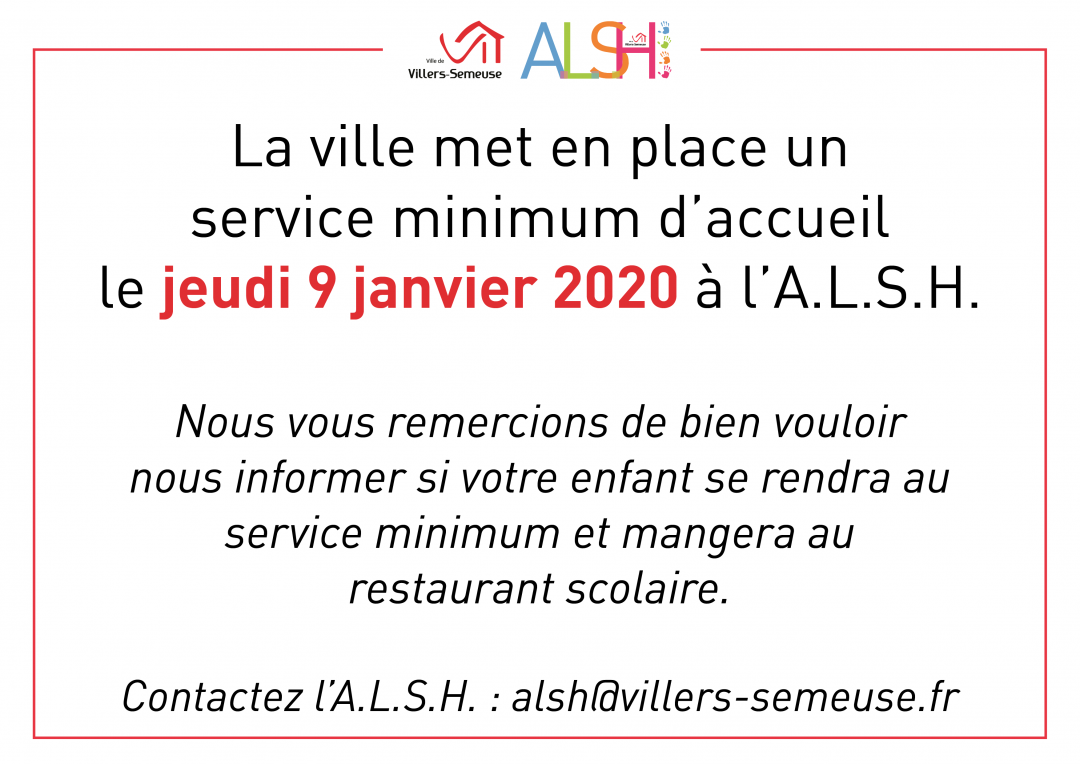 ➡️ Service d’accueil assuré par l’A.L.S.H. toute la journée avec garderie 🧸 et restauration scolaire 🍽 maintenues en raison de la grève nationale du jeudi 9 janvier 2020.