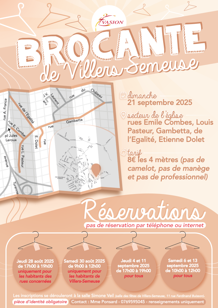 ℹ️ La brocante est gérée par l’association Évasion et non la commune – toute demande spécifique est à leur transmettre directement. La ville est un relais de communication pour cet événement mais n’intervient pas dans la gestion de la brocante.