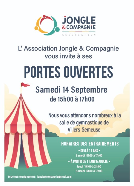 L’association Jongle & Compagnie vous invite à ses portes ouvertes le samedi 14 septembre 2024 de 15h00 à 17h00 à la salle de gymnastique – Complexe Sportif Roger Marche.