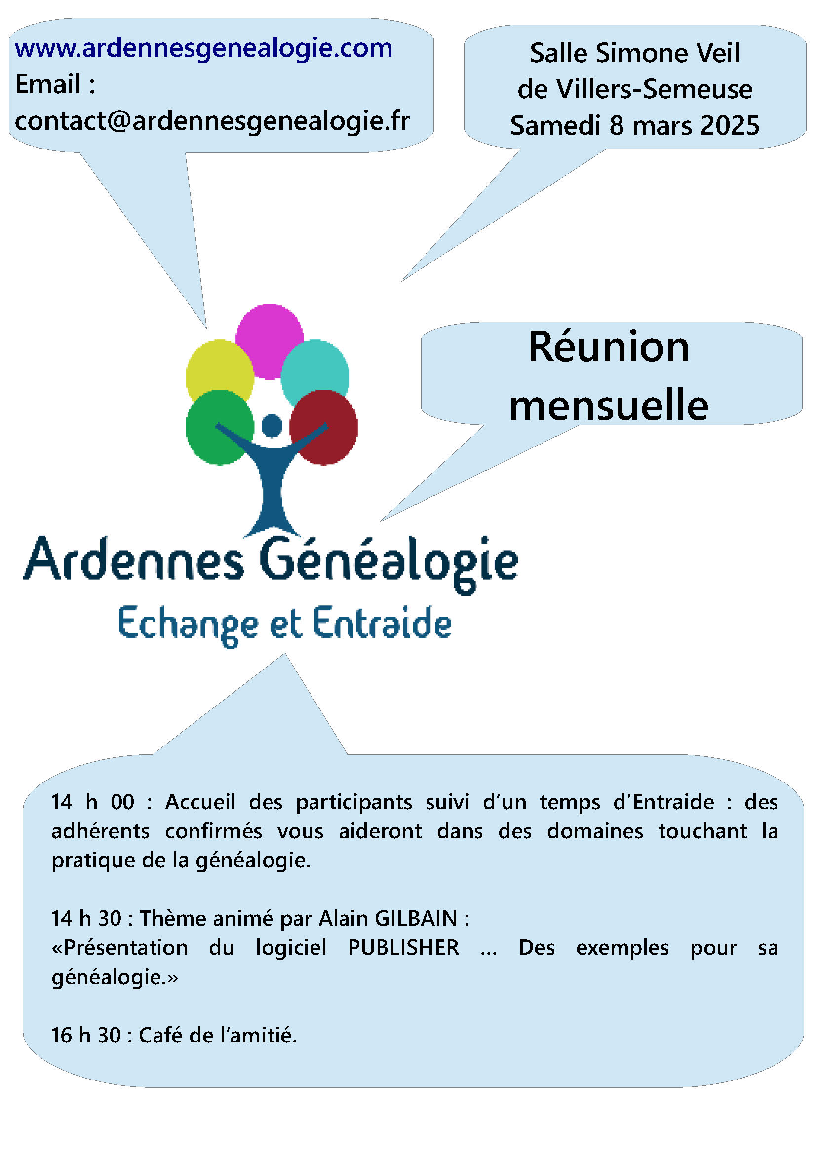 Salle des Fêtes 13 rue Ferdinand Buisson, Villers-SemeuseRéunion mensuelle d’Ardennes Généalogie www.ardennesgenealogie.com Email : contact@ardennesgenealogie.fr Salle Simone Veil de Villers-Semeuse Samedi 8 mars 2025 14 h 00 : Accueil des participants suivi […]