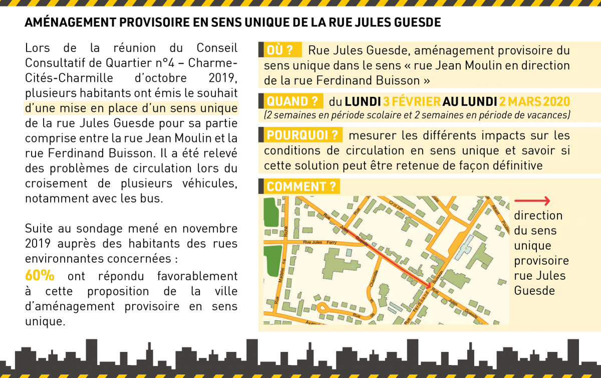 Lors de la réunion du Conseil Consultatif de Quartier n°4 – Charme-Cités-Charmille d’octobre 2019, plusieurs habitants ont émis le souhait d’une mise en place d’un sens unique de la rue Jules Guesde pour sa partie comprise entre la rue Jean Moulin et la rue Ferdinand Buisson. Il a été relevé des problèmes de circulation lors du croisement de plusieurs véhicules, notamment avec les bus.