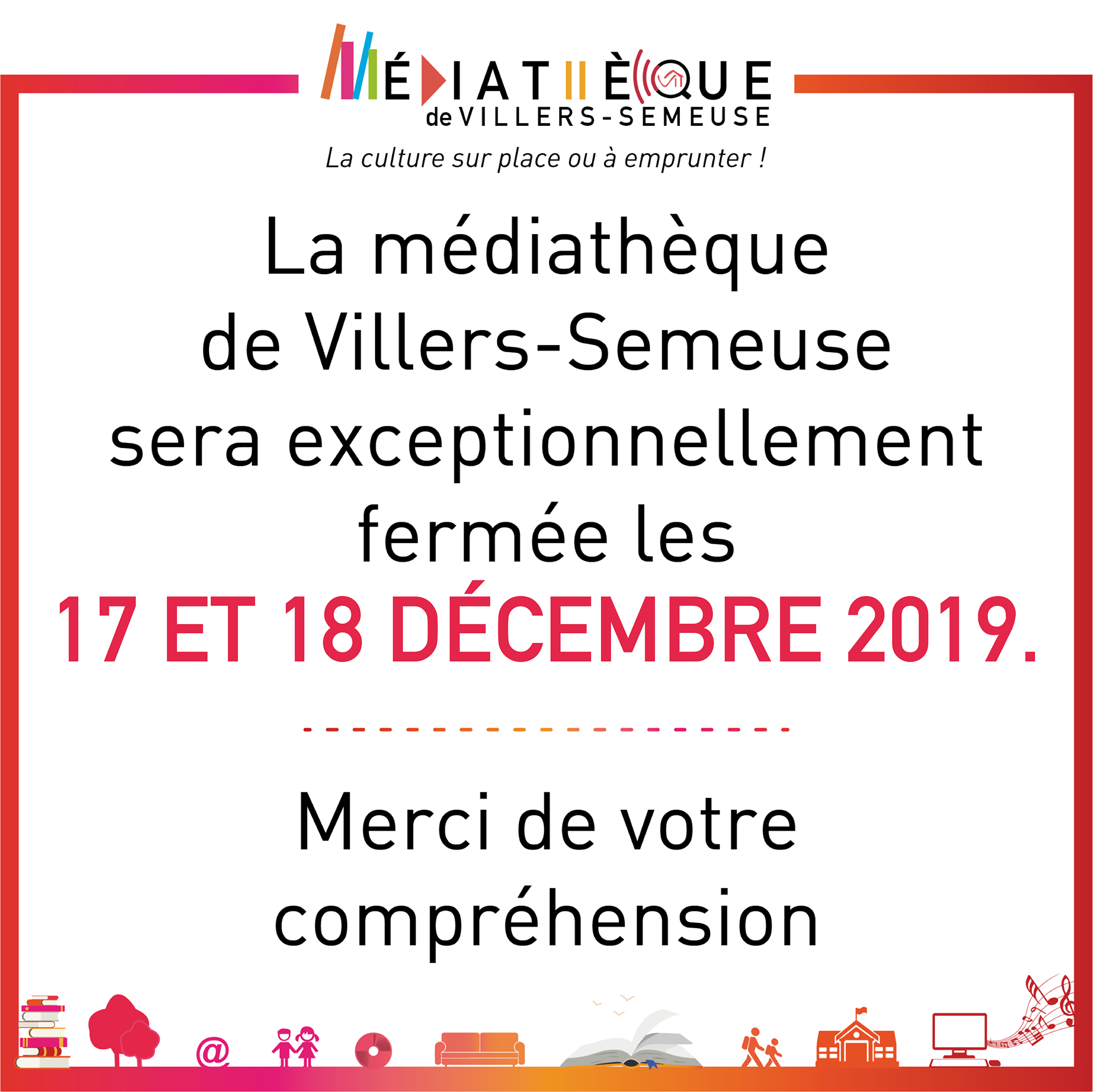 La Médiathèque de Villers-Semeuse sera exceptionnellement fermée mardi 17 et mercredi 18 décembre 2019, le bibliothécaire étant souffrant. Merci de votre compréhension !