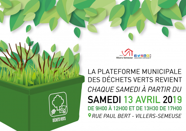 ➡️ La plateforme municipale, rue Paul Bert, recueille vos déchets verts, chaque samedi à partir du 13 avril 2019, de 9h00 à 12h00 et de 13h30 à 17h00, à hauteur d’1m cube par foyer 🌿