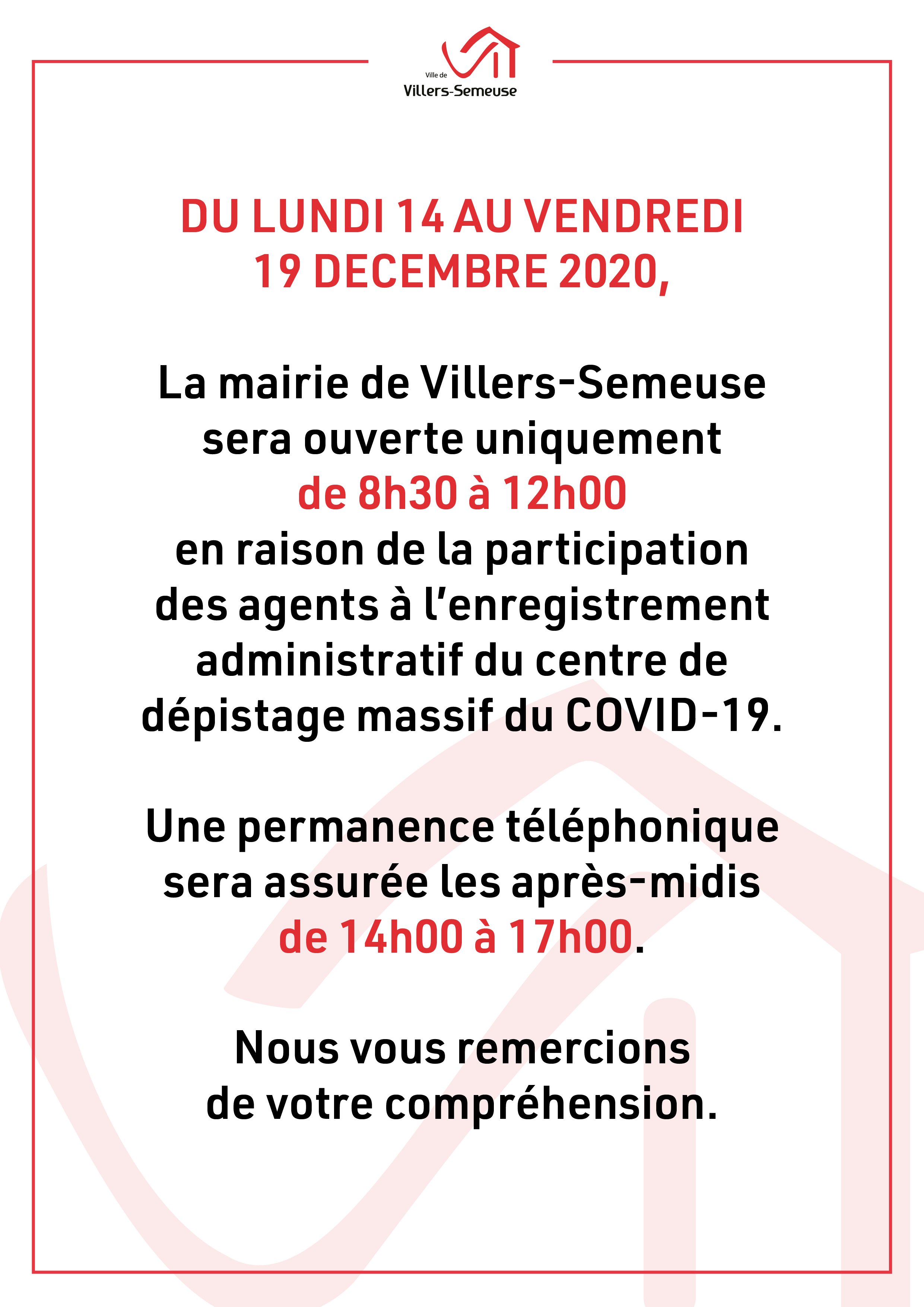 En raison de la participation des agents à l’enregistrement administratif du centre, la mairie de Villers-Semeuse sera ouverte uniquement de 8h30 à 12h00 du lundi 14 au vendredi 19 décembre 2020. Une permanence téléphonique sera assurée les après-midis de 14h00 à 17h00.