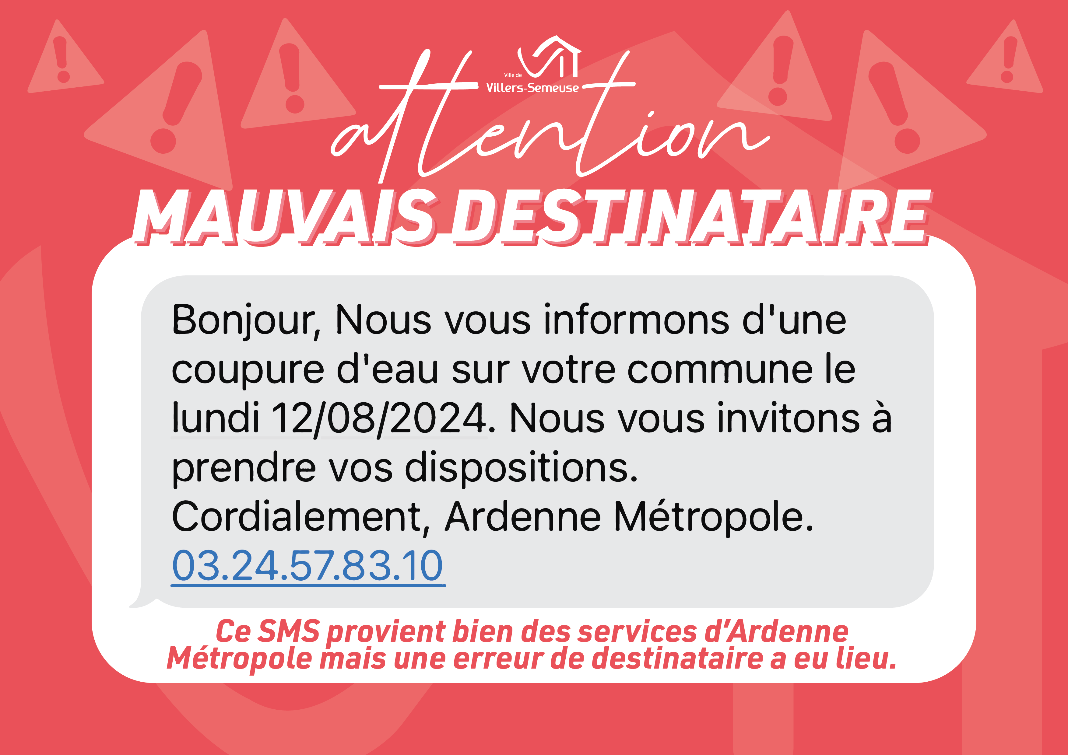 👉 Après contact de la ville auprès du service des eaux de l’agglomération, il s’avère que ce SMS était destiné aux habitants de Ville-sur-Lumes et non notre commune.